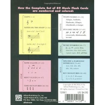 Includes all notes, symbols, and terms needed for the first two years of study on any musical instrument. Cards are color-coded by category and are numbered on the back.
