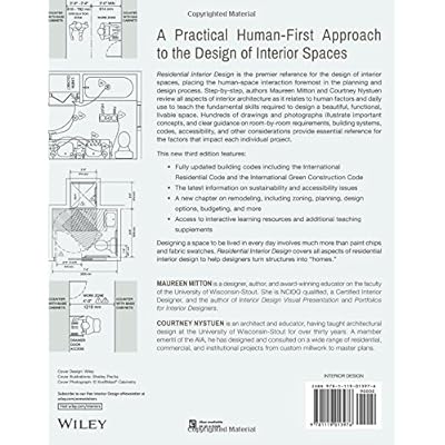 From the Back Cover A Practical Human-First Approach to the Design of Interior Spaces Residential Interior Design is the premier reference for the design of interior spaces, placing the human-space interaction foremost in the planning and design process. Step-by-step, authors Maureen Mitton and Courtney Nystuen review all aspects of interior architecture as it relates to human factors and daily use to teach the fundamental skills required to design a beautiful, functional, livable space. Hundreds of drawings and photographs illustrate important concepts, and clear guidance on room-by-room requirements, building systems, codes, accessibility, and other considerations provide essential reference for the factors that impact each individual project. This new third edition features: Fully updated building codes including the International Residential Code and the International Green Construction Code The latest information on sustainability and accessibility issues A new chapter on remodeling, including zoning, planning, design options, budgeting, and more Access to interactive learning resources and additional teaching supplements Designing a space to be lived in every day involves much more than paint chips and fabric swatches. Residential Interior Design covers all aspects of residential interior design to help designers turn structures into "homes." Read more About the Author MAUREEN MITTON is a designer, author, and award-winning educator on the faculty of the University of Wisconsin-Stout. She is NCIDQ qualified, a Certified Interior Designer, and the author of Interior Design Visual Presentation and Portfolios for Interior Designers. COURTNEY NYSTUEN is an architect and educator, having taught architectural design at the University of Wisconsin-Stout for over thirty years. A member emeriti of the AIA, he has designed and consulted on a wide range of residential, commercial, and institutional projects from custom millwork to master plans. Read more